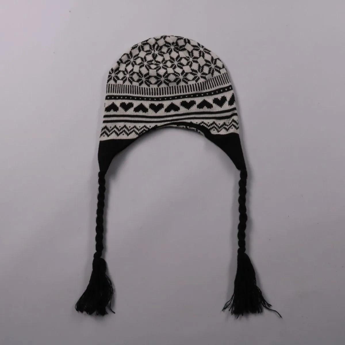 Вязаная зимняя шапка-ушанка с жаккардовым черно-белым узором и длинными завязками с кисточками. Подойдет для прогулок и повседневной носки в холодную погоду. Внутри мягкая флисовая подкладка, хорошо сохраняет тепло и прикрывает уши.