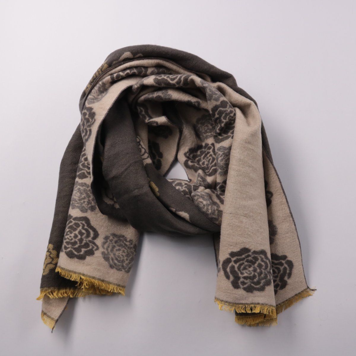 Шарф с цветочным узором в бежево-коричневой гамме и бахромой по краям. Подойдёт для повседневных образов в прохладную погоду и как акцент к однотонной верхней одежде. Лёгкий в складывании и удобно носить в сумке.