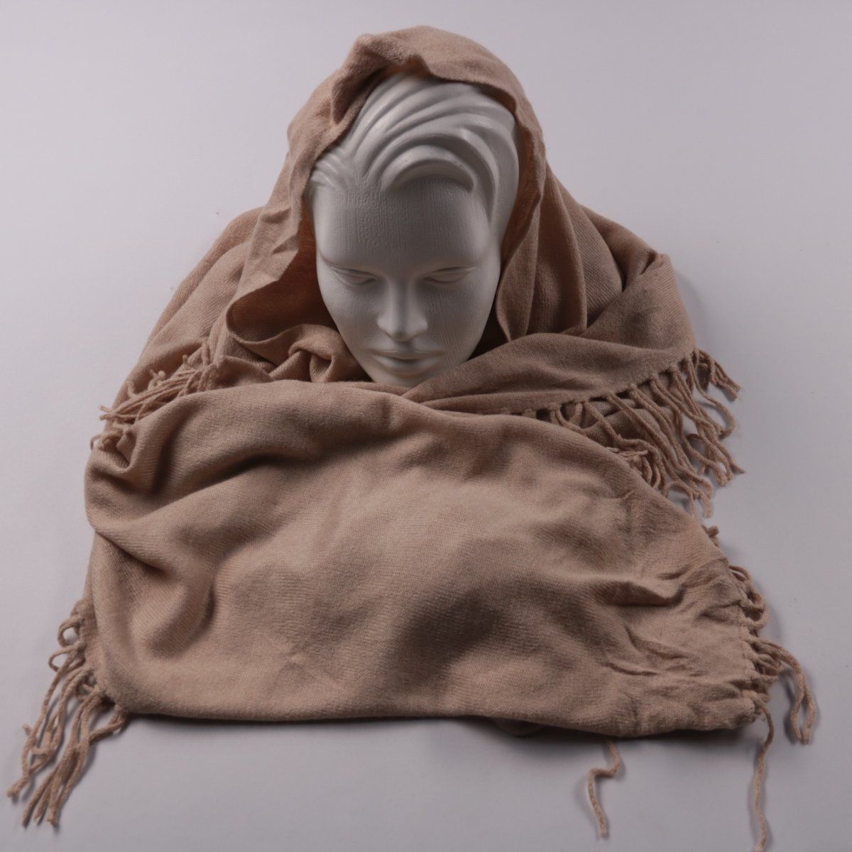 Шарф с кисточками в бежево-коричневом оттенке, без видимого бренда. Подойдёт для повседневных образов в прохладную погоду, можно носить как шарф или накидывать на плечи. Мягкая ткань хорошо драпируется и добавляет тепла.