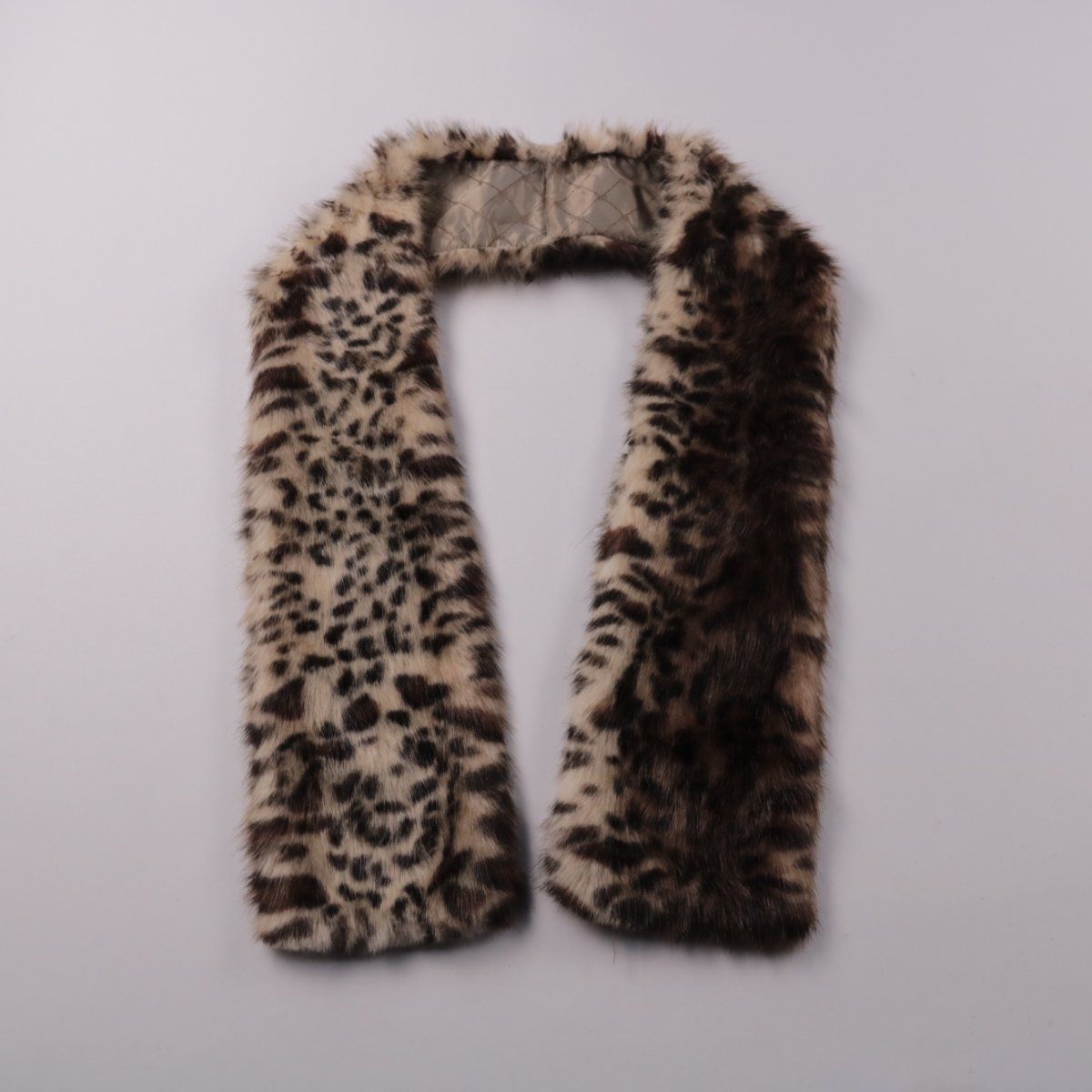 Меховой шарф с леопардовым принтом, без указания бренда. Подойдёт для зимних прогулок и как акцент к пальто или куртке. Тёплый и мягкий, удобно носить как воротник и защищает шею от ветра.