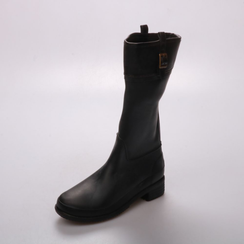 Женские резиновые сапоги Achillees чёрного цвета на устойчивом невысоком каблуке, с декоративной пряжкой сбоку. Подойдут для дождливой погоды и прогулок по городу или даче. Практичный плюс — легко моются и не промокают.