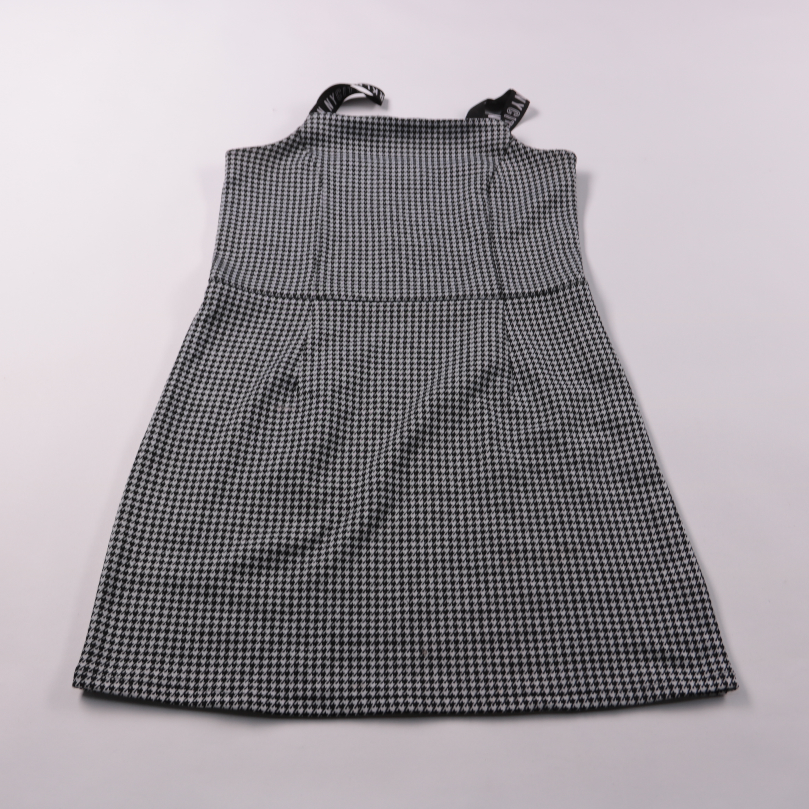Сарафан-платье C&A в черно-белую «гусиную лапку» с завышенной линией талии. Подойдёт для школы и повседневных образов с водолазкой или лонгсливом. Ткань держит форму и не требует сложного ухода.