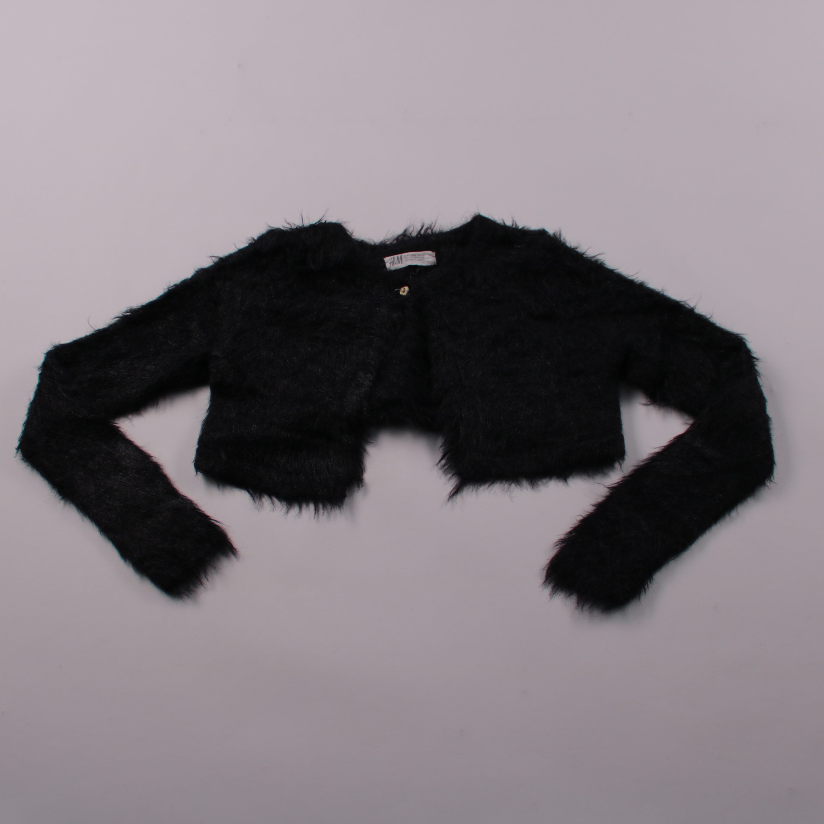 Чёрное пушистое болеро H&M с длинными рукавами и застёжкой на одну пуговицу. Подойдёт для праздников и накидки поверх платья или топа в прохладном помещении. Лёгкое и компактное, удобно брать с собой.