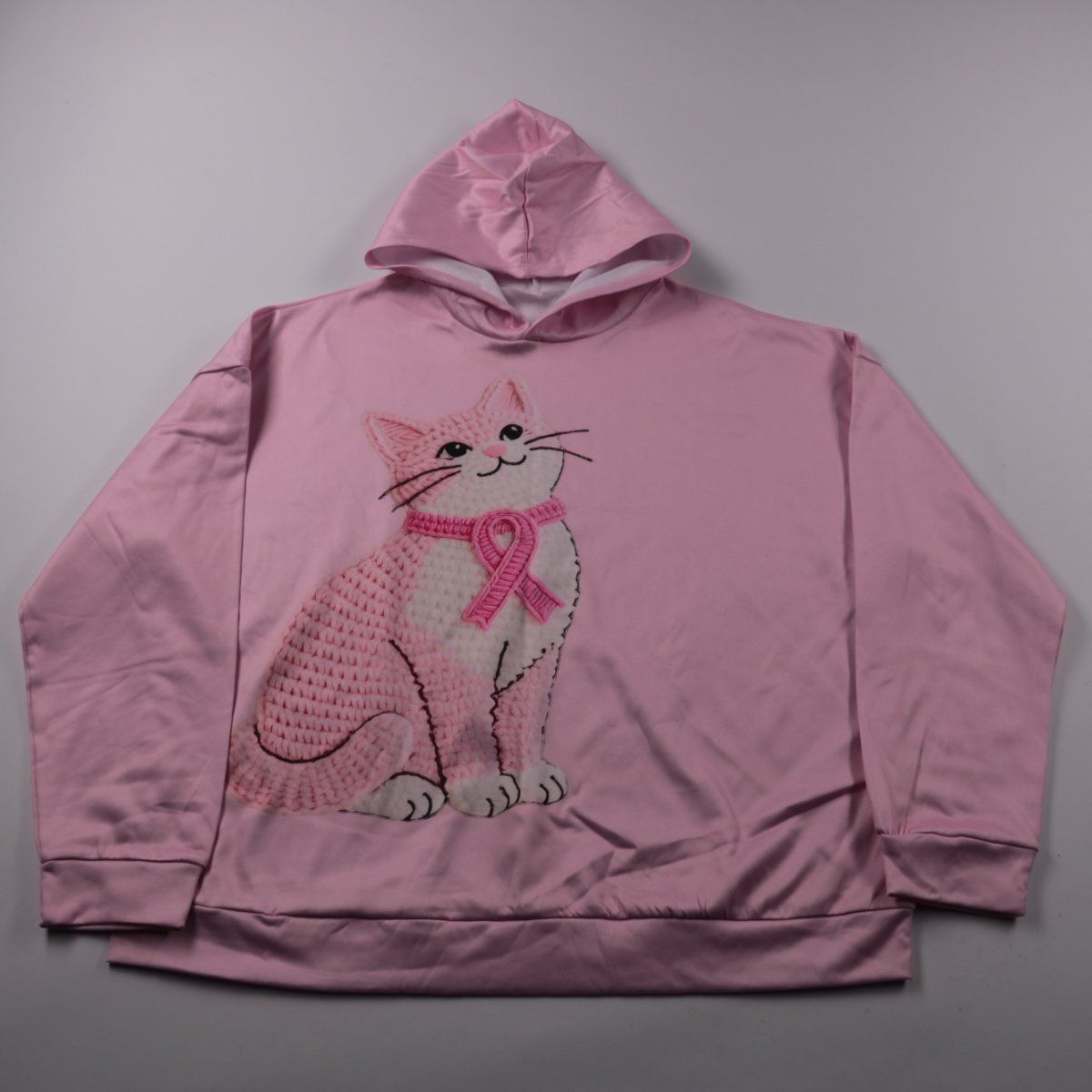 Розовая толстовка с капюшоном и крупным принтом котика спереди. Подойдёт для повседневной носки в прохладную погоду и для прогулок. Капюшон помогает защитить от ветра, а мягкий трикотаж комфортен в носке.