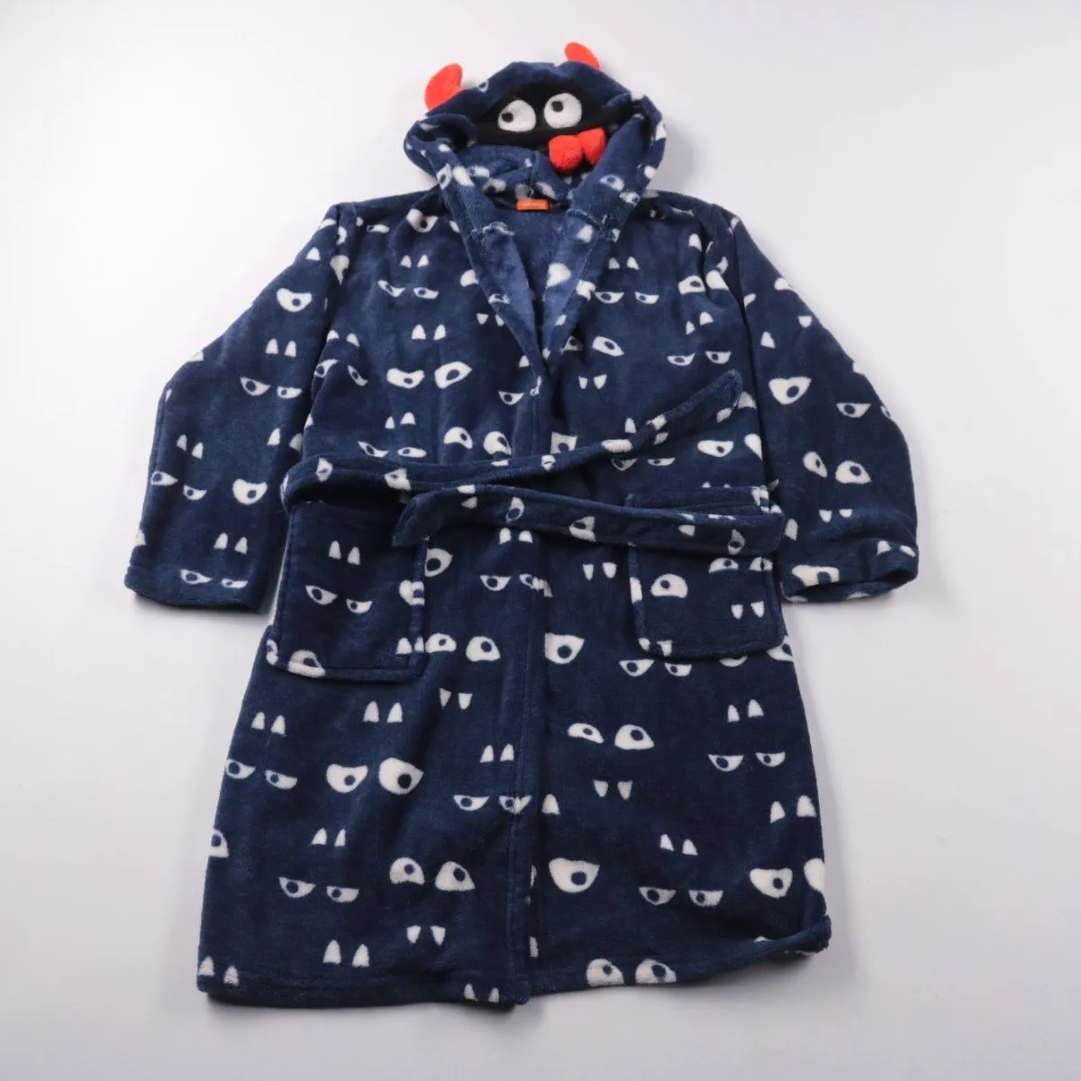 Детский флисовый халат Hema тёмно-синего цвета с забавным принтом и капюшоном. Подойдёт для дома после душа или для прохладных вечеров. Мягкий материал быстро согревает и приятен к телу.