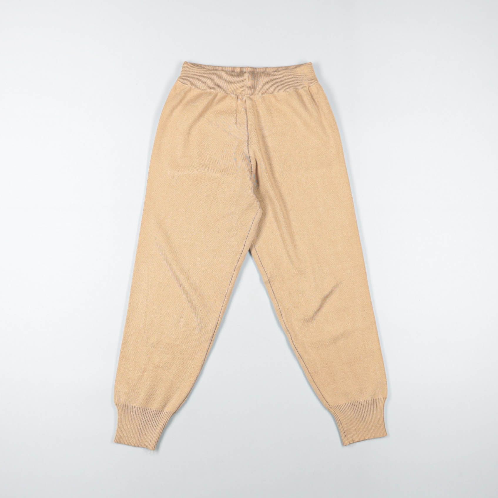 Вязаные детские брюки спокойного бежевого цвета с широкой резинкой на поясе и манжетами внизу. Подойдут для дома, прогулок и садика; сзади есть контрастные карманы с узором «гусиная лапка». Эластичный пояс хорошо держится и не сковывает движения.