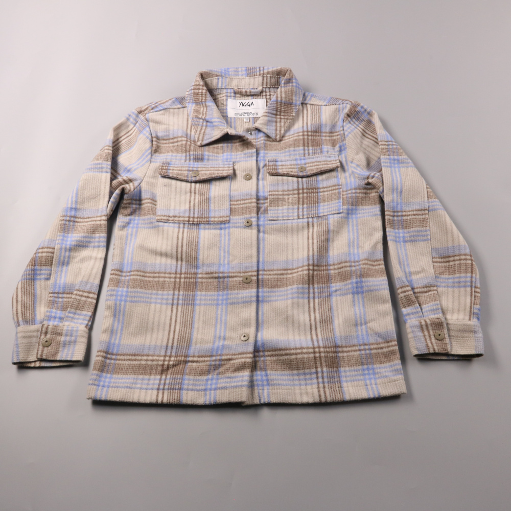 Рубашка YIGGA в клетку в бежево-голубых тонах, на кнопках и с двумя нагрудными карманами. Подойдёт для школы и прогулок в прохладную погоду как рубашка или лёгкая верхняя рубашка-овер. Полиэстеровая ткань проще в уходе и быстро сохнет.