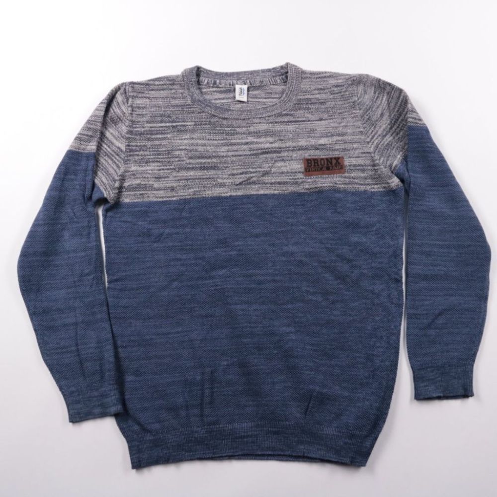 Свитер Yigga для мальчика в сине-серой расцветке с нашивкой Bronx на груди. Подойдёт для школы и прогулок в прохладную погоду, хорошо смотрится с джинсами и брюками. Натуральная шерсть в составе хорошо сохраняет тепло.