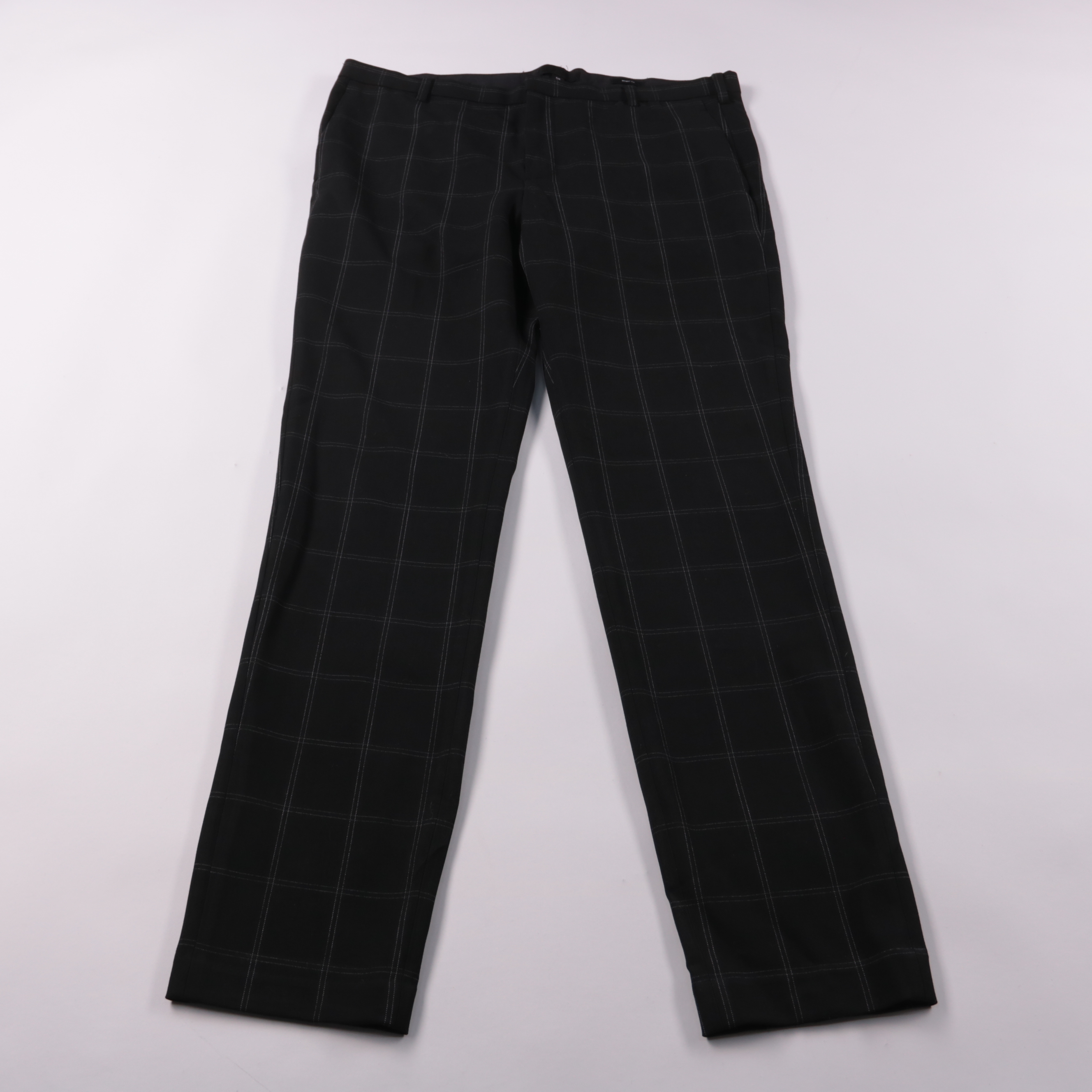 Мужские брюки H&M чёрного цвета в клетку, прямого кроя. Подойдут для офиса и повседневных образов в демисезон. Практичный плюс — ткань с эластаном, поэтому брюки чуть тянутся и комфортно сидят.