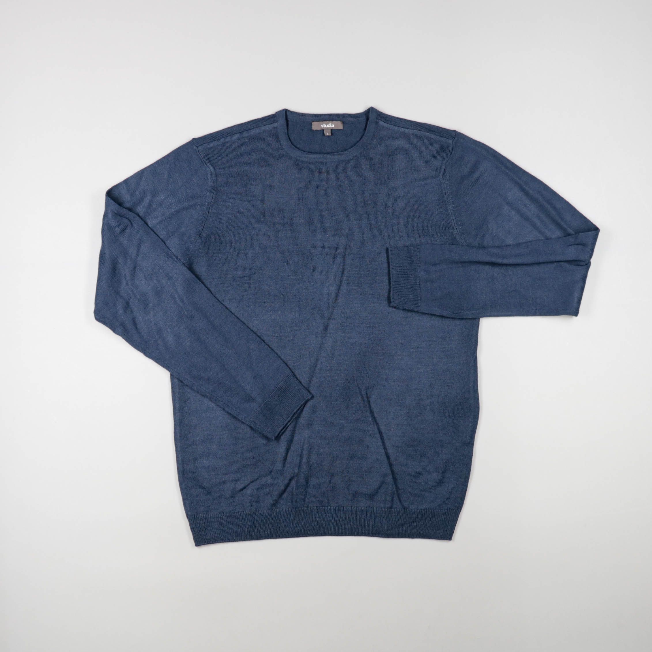 Мужской джемпер Studio синего цвета с круглым вырезом и манжетами на рукавах. Подойдёт для повседневной носки и офисных образов в прохладную погоду, легко сочетается с джинсами и брюками. Тонкий трикотаж комфортно сидит и удобно носится под куртку.