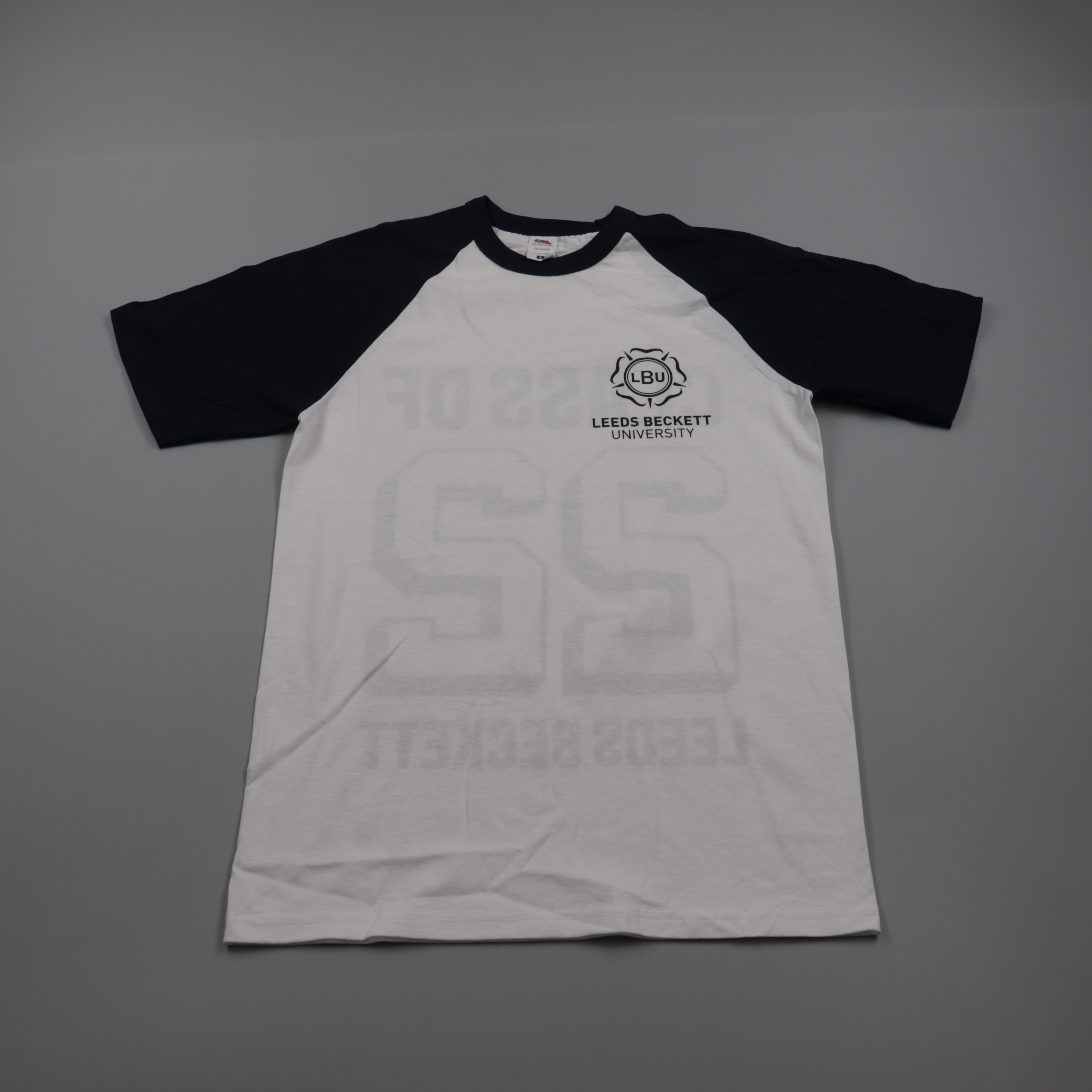 Футболка Fruit of the Loom в стиле реглан: белый корпус и чёрные рукава, принты Leeds Beckett University (Class of 22). Подойдёт для повседневной носки, учёбы и прогулок в тёплую погоду. Натуральный хлопок хорошо дышит и комфортен в носке.