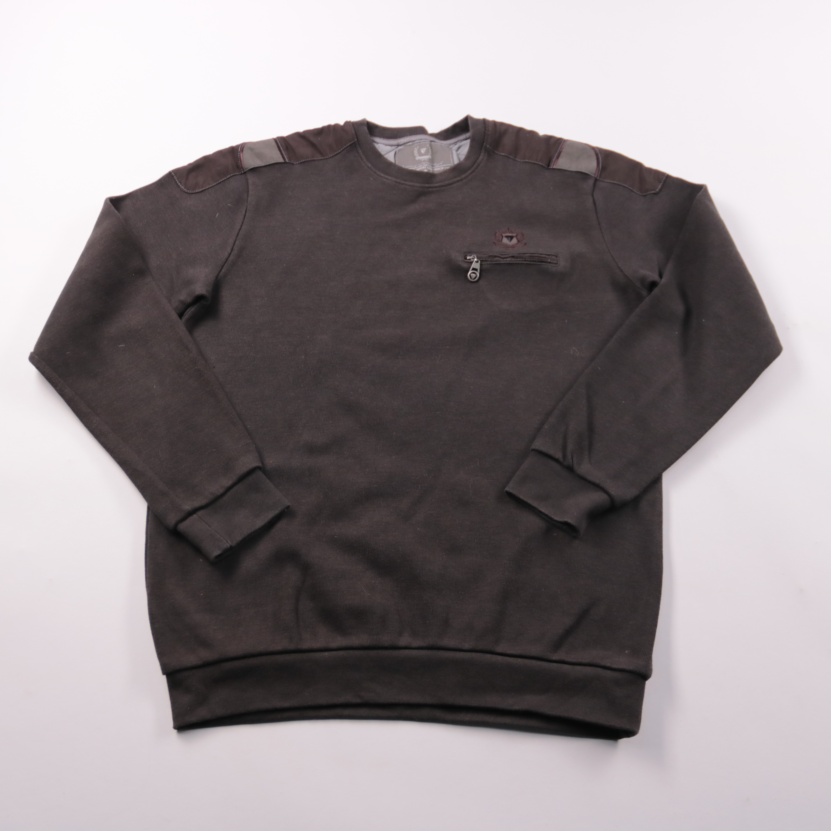 Мужской свитшот Brothers тёмно-коричневого цвета с круглым вырезом и декоративными вставками на плечах. Подойдёт для повседневной носки в прохладную погоду и для офиса в стиле casual. Есть удобный нагрудный карман на молнии для мелочей.