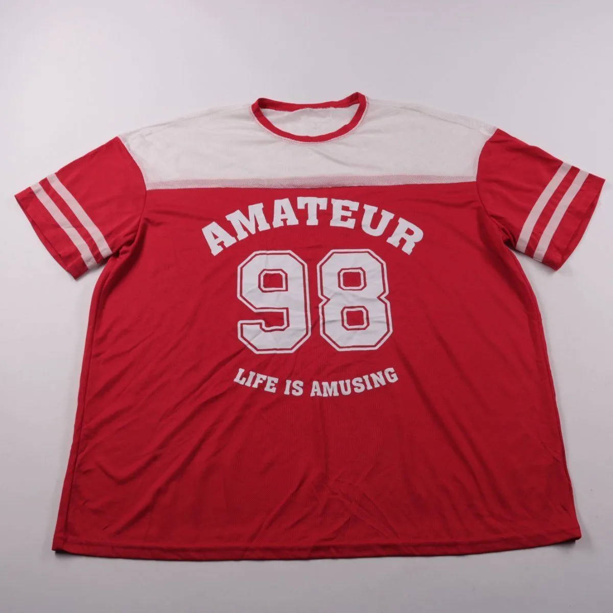 Футболка Shein Curve красно-белая с принтом «AMATEUR 98» в спортивном стиле. Подойдёт для повседневной носки, прогулок и домашнего отдыха. Лёгкий полиэстер быстро сохнет и почти не мнётся.