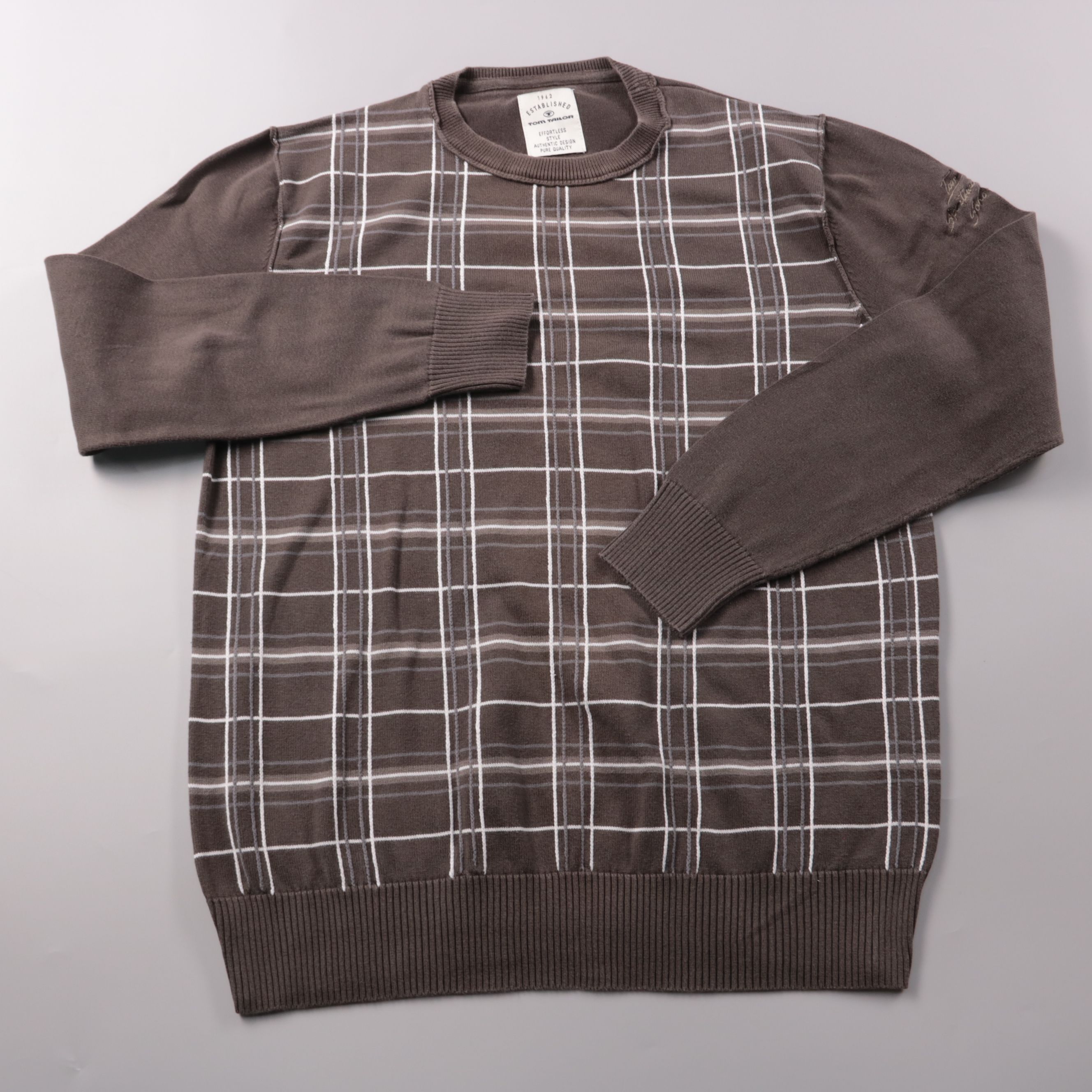 Мужской джемпер Tom Tailor из 100% хлопка, коричневый с принтом в клетку и круглым вырезом. Подойдёт для повседневной носки в прохладную погоду и как слой под куртку. Хлопковый трикотаж хорошо дышит и не требует сложного ухода.