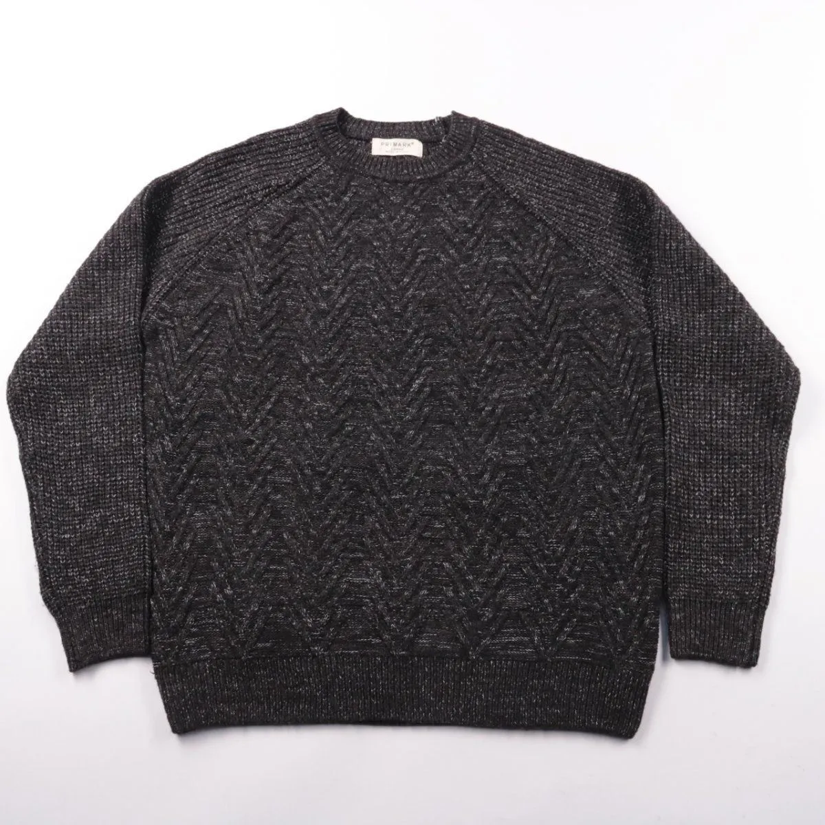 Мужской свитер Primark тёмно-серого меланжевого цвета с фактурной вязкой и круглым вырезом. Подойдёт для повседневной носки в прохладную погоду и под куртку/пальто. Плотный трикотаж хорошо держит форму и греет.