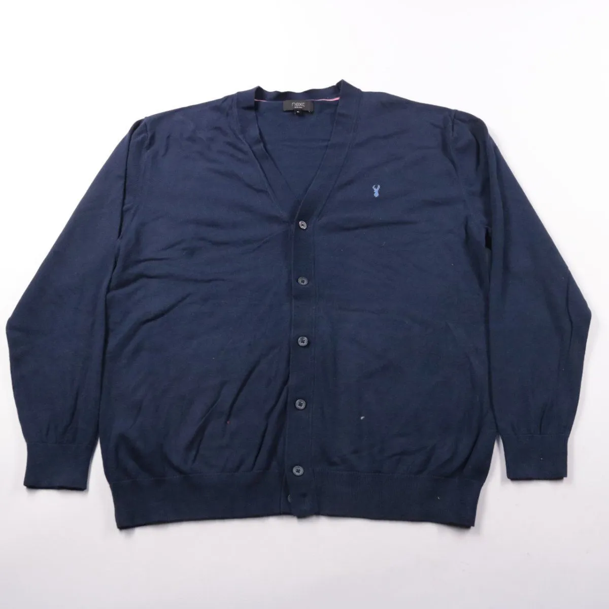 Мужской кардиган Next на пуговицах, тёмно-синего цвета, с V‑вырезом и небольшим логотипом на груди. Подойдёт для офиса и повседневной носки в прохладную погоду, удобно надевать поверх футболки или рубашки. Практичный вариант: легко комбинируется с джинсами и брюками и не занимает много места в сумке.