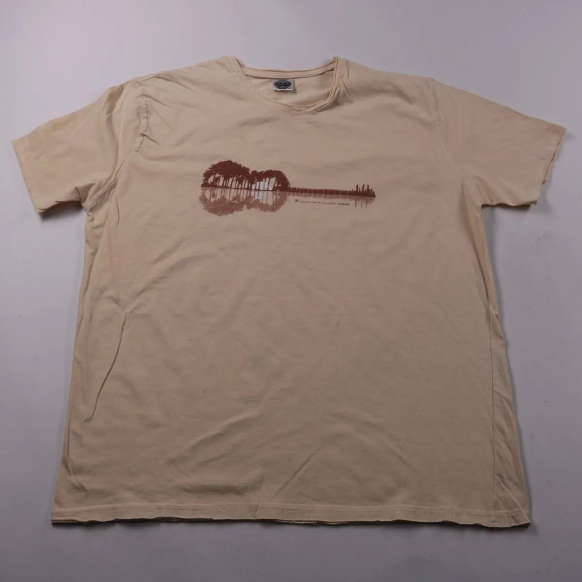 Мужская футболка Chromatics бежевого цвета с V-образным вырезом и принтом в виде гитары. Подойдёт для повседневной носки летом и в помещении круглый год. Натуральный хлопок хорошо пропускает воздух и комфортен в носке.