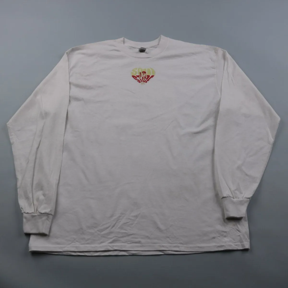 Лонгслив Gildan из плотного хлопка белого цвета с небольшим принтом спереди и крупным принтом на спине. Подойдёт для повседневной носки и под слой в прохладную погоду. Хлопковая ткань хорошо дышит и комфортна в носке.