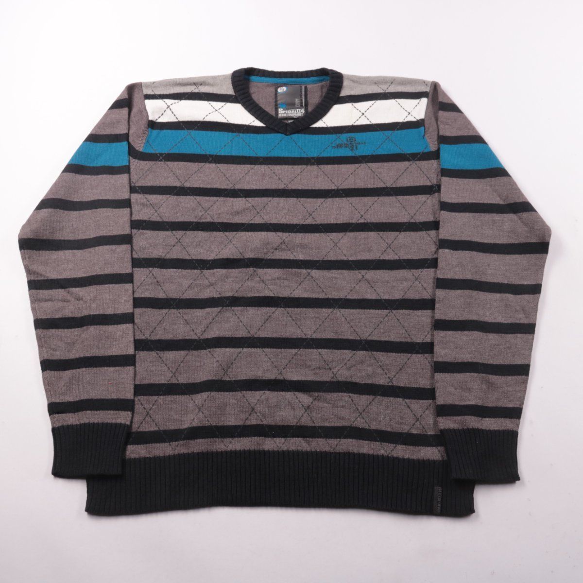 Мужской джемпер Tom Tailor с V-образным вырезом и полосатым рисунком в серо-чёрных тонах с голубым акцентом. Подойдёт для повседневной носки в прохладную погоду и для офиса в стиле casual. Практичен в уходе за счёт смесового состава хлопок/акрил.