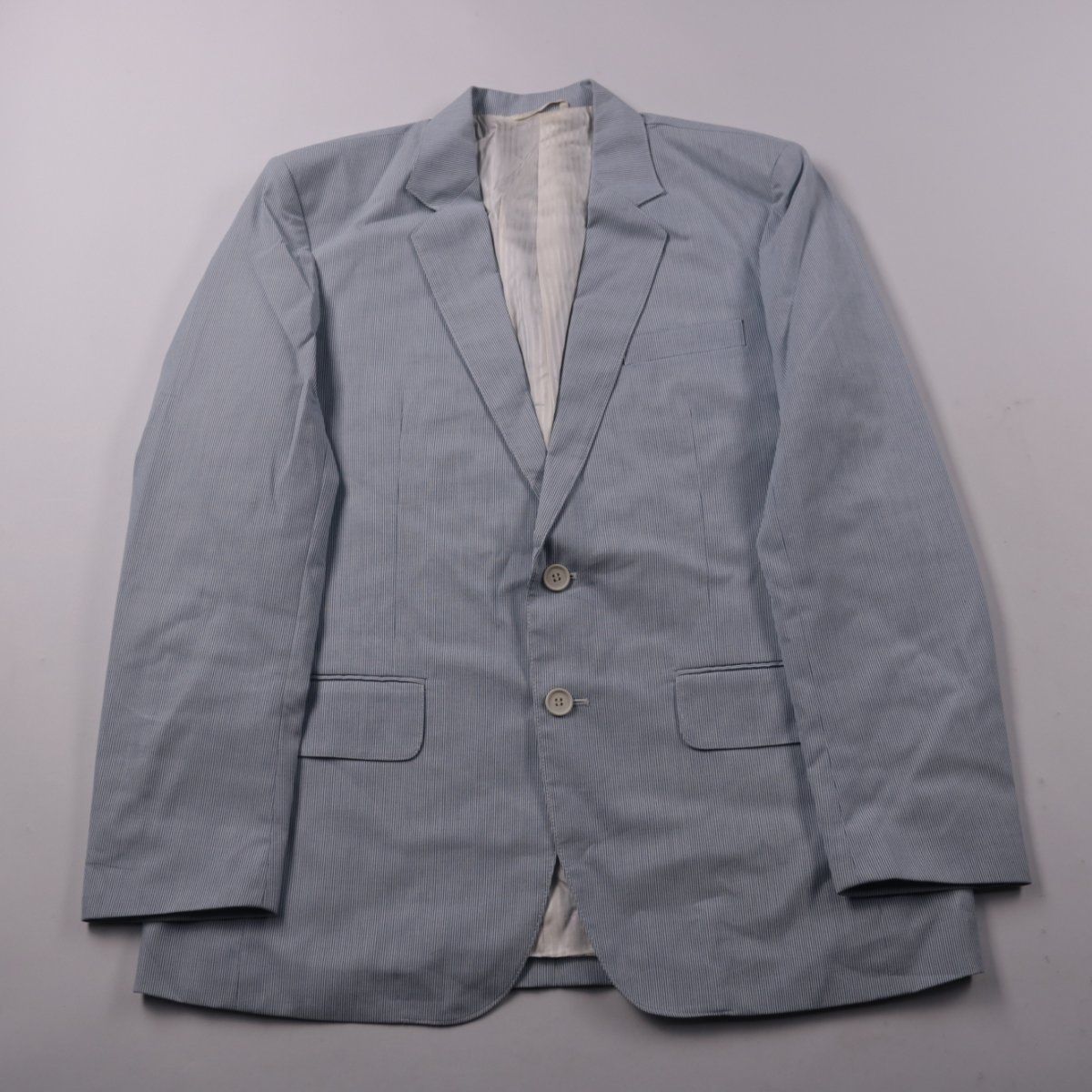 Мужской пиджак BMS светло-голубого цвета в мелкую полоску, с застёжкой на две пуговицы и отложным воротником. Подойдёт для офиса, деловых встреч и мероприятий в тёплое время года. Смесовая ткань (полиэстер с хлопком) практична в уходе и меньше мнётся.