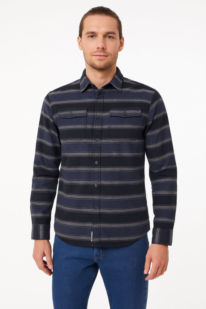 Мужская рубашка De Neven Van Fons из 100% хлопка, в темно-синей гамме с полосатым рисунком и нагрудными карманами. Подойдет для повседневной носки и офиса в стиле casual, хорошо смотрится с джинсами или чиносами. Хлопок приятен к телу и дышит, поэтому ...