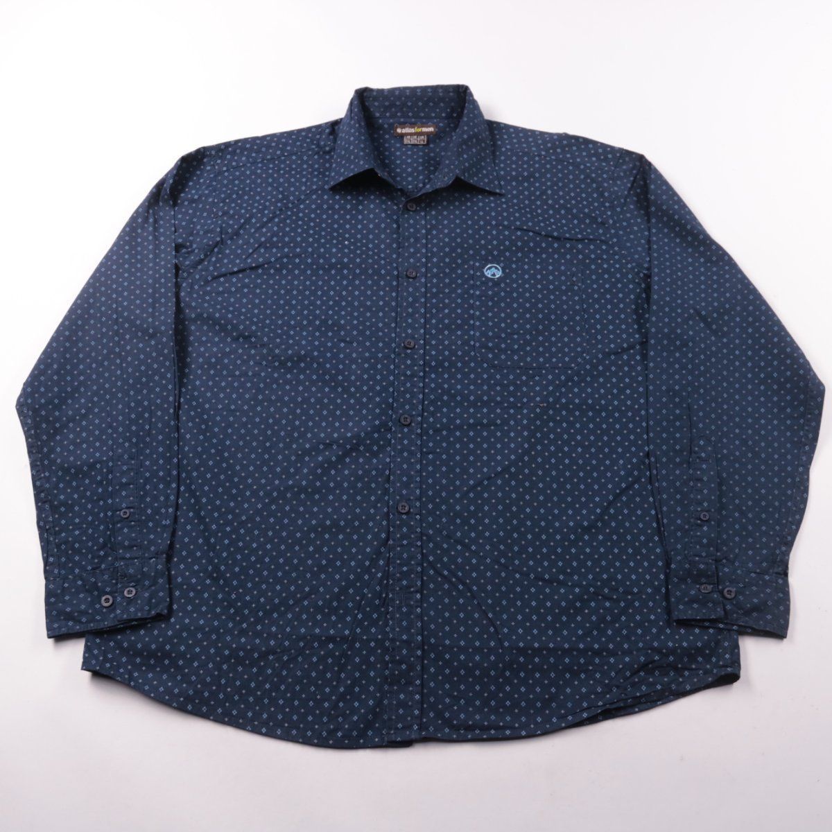 Мужская рубашка Atlasformen тёмно-синего цвета с мелким геометрическим принтом, на пуговицах и с нагрудным карманом. Подойдёт для повседневной носки и офиса в сочетании с джинсами или брюками. Практичный плюс — немаркий цвет и универсальный рисунок.
