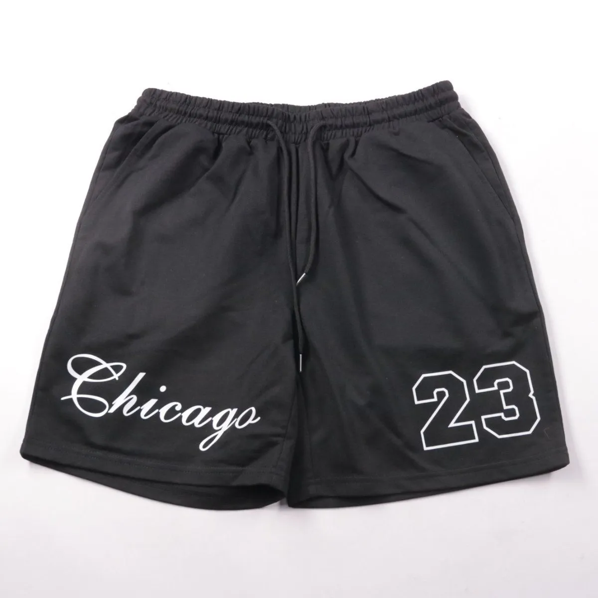 Мужские шорты SHEIN из полиэстера, чёрного цвета, с принтом «Chicago 23». Подойдут для спорта и повседневной носки в тёплую погоду. Эластичный пояс со шнурком помогает удобно регулировать посадку.