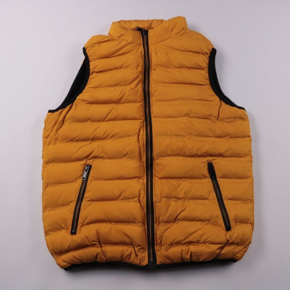 Мужской стёганый жилет без бренда, цвет горчичный, застёжка на молнию и карманы на молниях. Подойдёт для осени/весны и прохладного лета, удобно носить поверх худи или свитера. Лёгкий и компактный, хорошо добавляет тепло без лишнего объёма в рукавах.