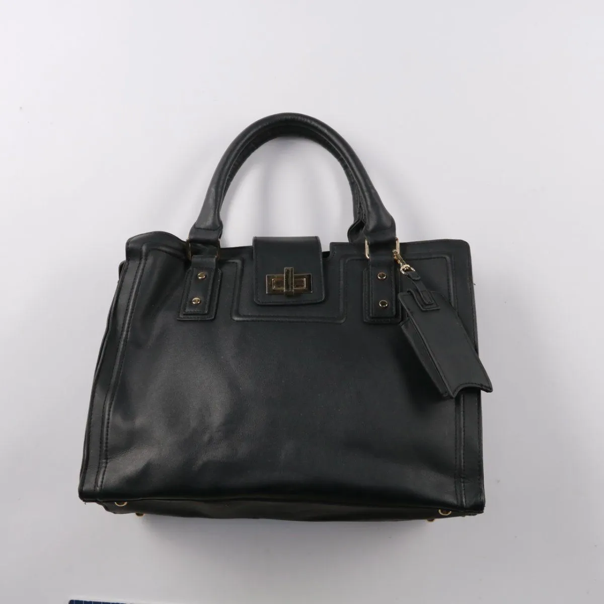 Женская сумка из гладкого материала с короткими ручками и поворотным замком, в классическом чёрном цвете. Подойдёт для города и офиса: внутри несколько отделений для документов и мелочей. Удобно носить в руке, устойчивое дно с металлическими ножками меньше пачкается.
