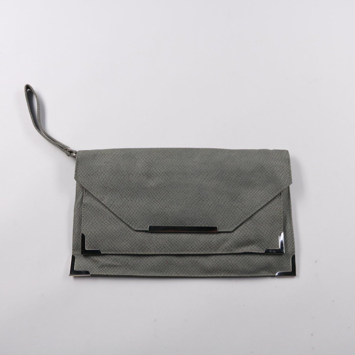 Женский клатч с откидным клапаном и петлёй на руку, выполнен в сером цвете с металлическими уголками. Подойдёт для вечернего выхода или на мероприятие, когда нужно взять только самое необходимое. Компактный формат удобно держать в руке, есть застёжка на кнопку.