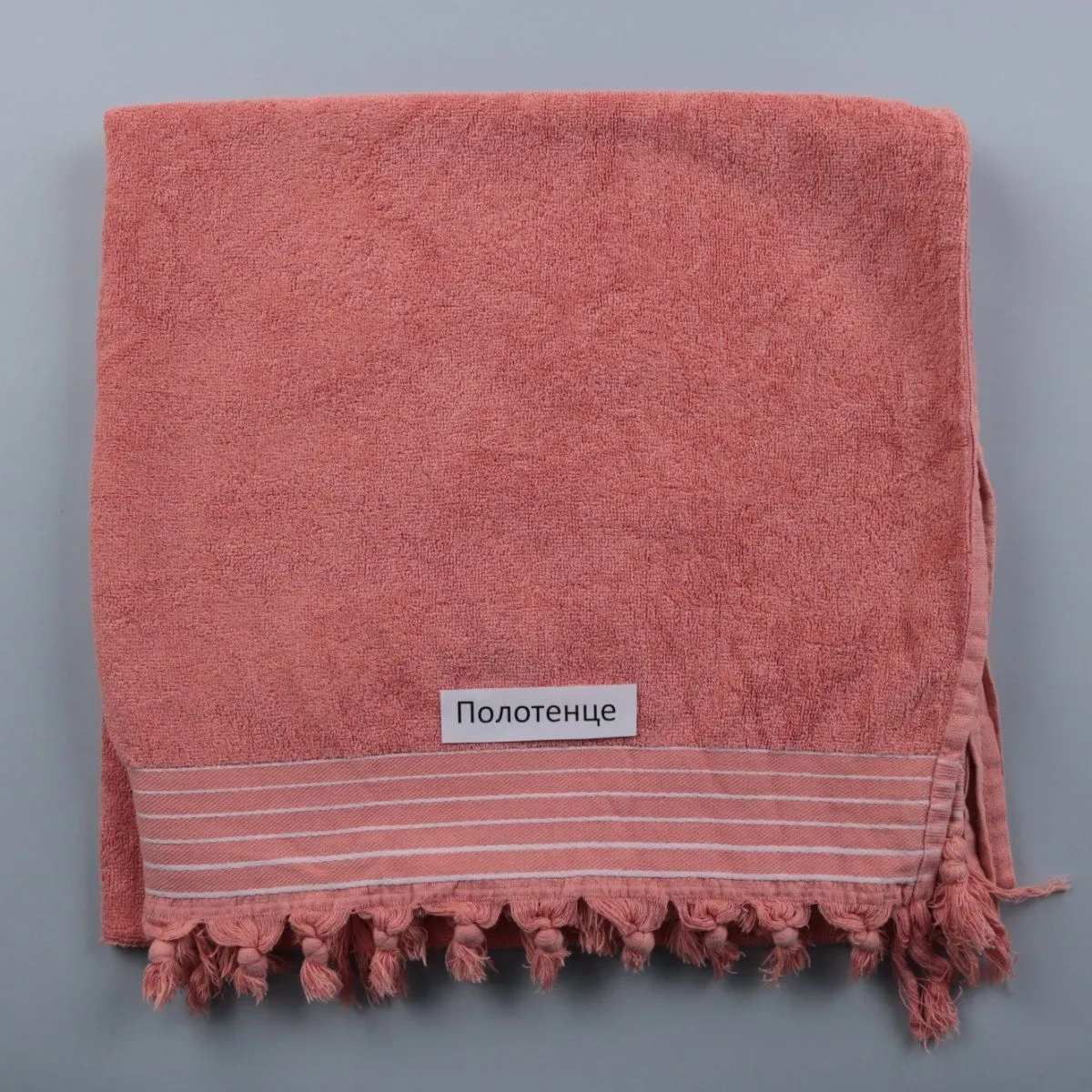 Полотенце из переработанного хлопка, мягкое и приятное на ощупь, с декоративной каймой и кисточками по краю. Подойдёт для ванной, бассейна или пляжа и хорошо впишется в спокойный интерьер. Хлопковая махра хорошо впитывает влагу и быстро сохнет.