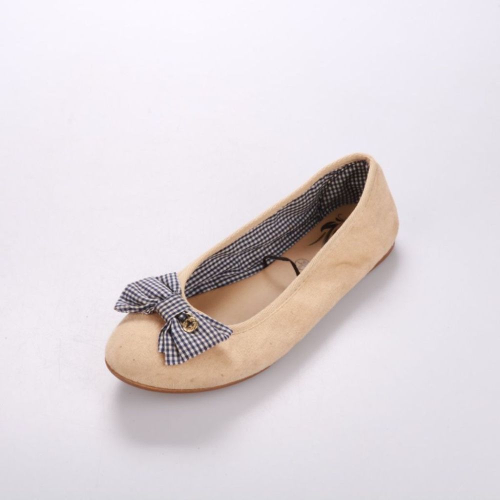 Женские балетки из светлого бежевого материала с декоративным бантом в клетку спереди. Подойдут для повседневных летних образов и прогулок, легко сочетаются с платьями и джинсами. Низкий ход делает их удобными для носки в течение дня.