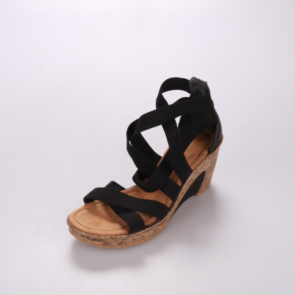 Босоножки Rieker на устойчивой танкетке с перекрещенными эластичными ремешками и пробковой отделкой подошвы. Подойдут на тёплую погоду для города и поездок, хорошо держатся на ноге. Практичный плюс — мягкая стелька и удобная колодка для длительной ходьбы.