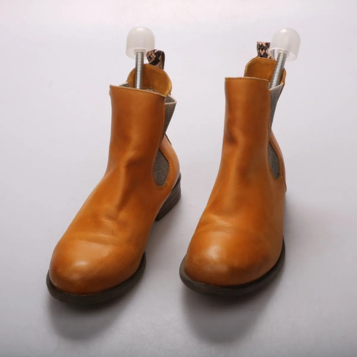 Женские ботильоны Remonte в стиле челси из гладкой кожи коньячно-коричневого цвета с эластичными вставками по бокам и невысоким устойчивым каблуком. Подойдут для повседневной носки в межсезонье и в городе. Удобно быстро обувать за счёт резинок и петли сзади.