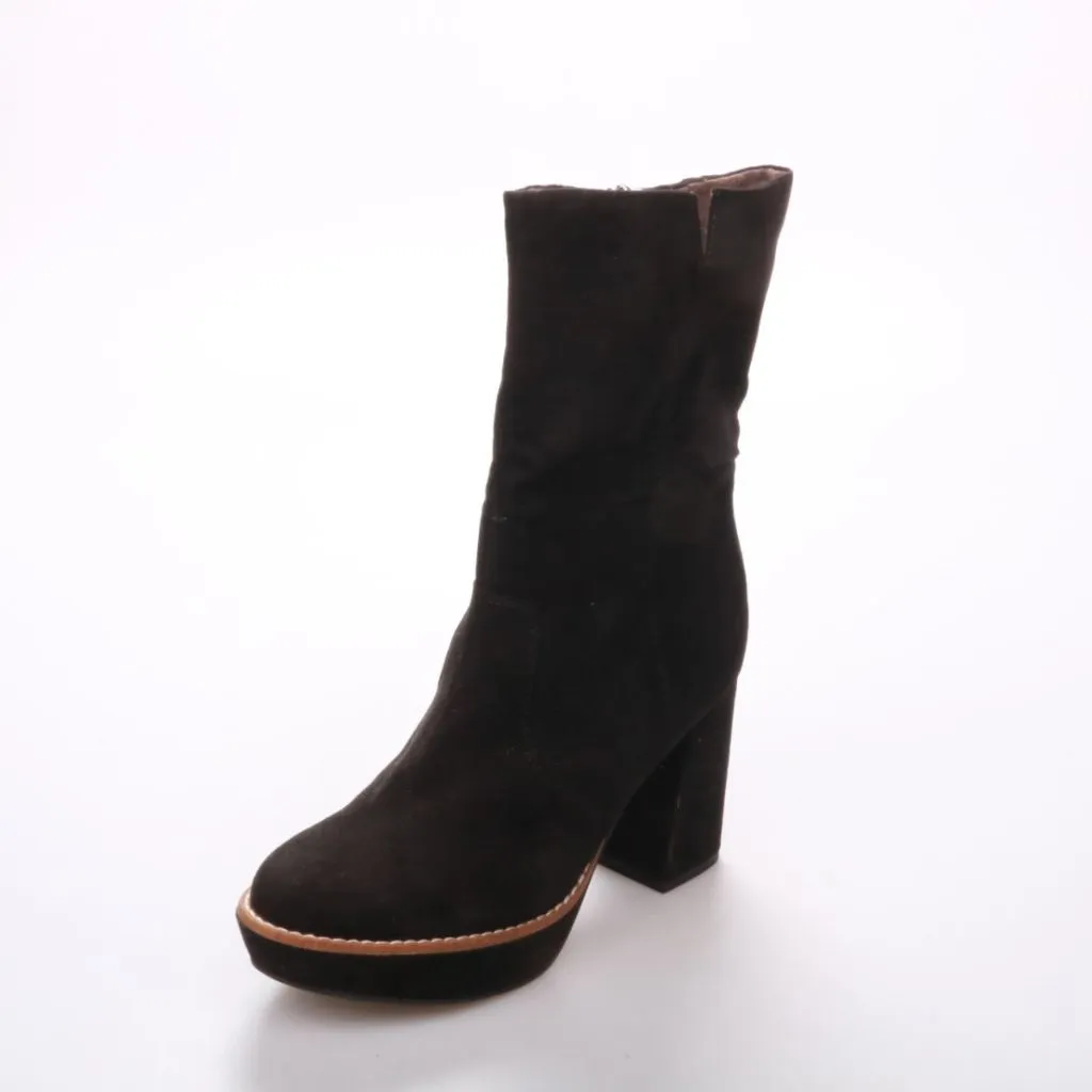 Замшевые ботильоны Tamaris чёрного цвета на устойчивом каблуке и платформе, застёжка на молнию сбоку. Подойдут для повседневных образов в демисезон, хорошо смотрятся с джинсами и платьями. Практичное преимущество — удобная посадка и устойчивый каблук д...