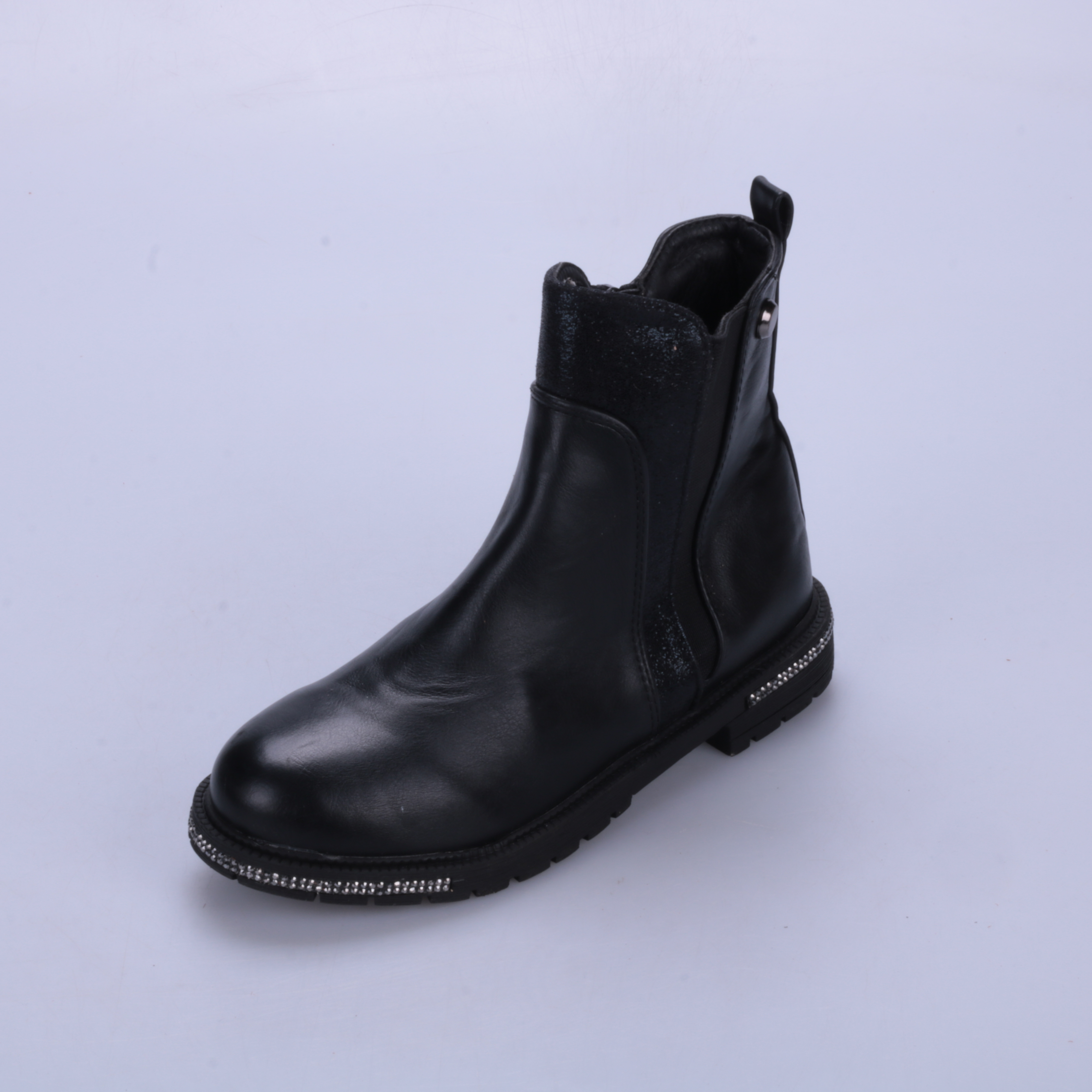 Женские ботинки без указанного бренда, чёрного цвета, с боковой молнией и декоративной отделкой по ранту. Подойдут для повседневной носки в демисезон, хорошо смотрятся с джинсами и платьями. Практичное преимущество — рифлёная подошва даёт более уверенн...