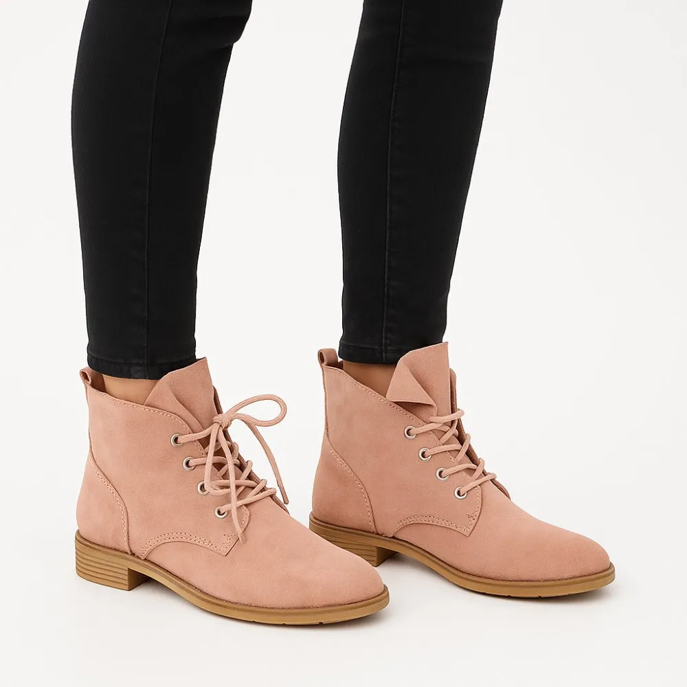 Женские демисезонные ботинки на шнуровке в нежно-розовом цвете. Подойдут для повседневных образов с джинсами и платьями в прохладную погоду. Устойчивая подошва и низкий каблук делают их удобными для прогулок и длительной носки.