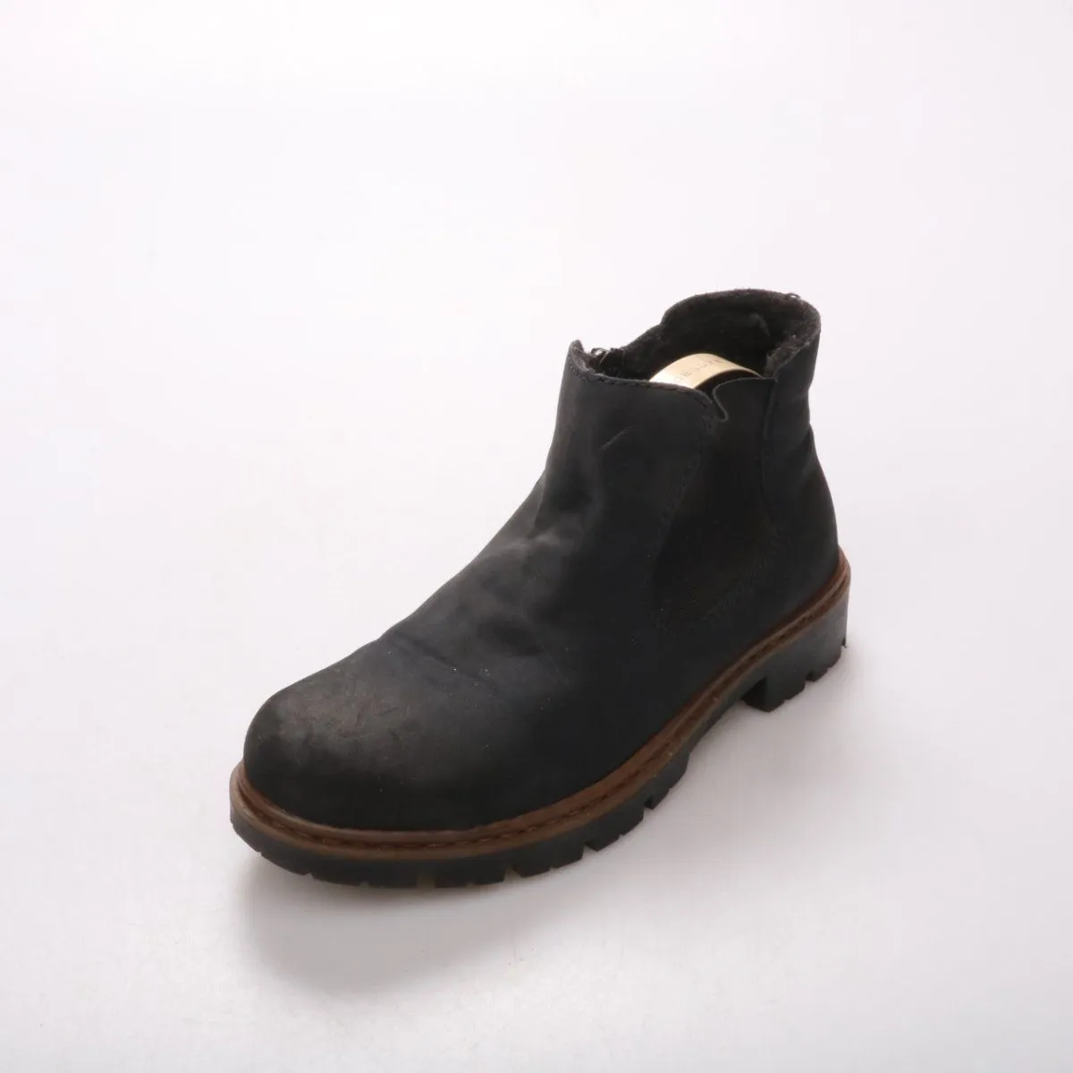 Мужские ботинки Rieker в чёрном цвете с боковой молнией и фактурной подошвой. Подойдут для повседневной носки в межсезонье и прохладную погоду, хорошо сочетаются с джинсами и брюками. Рельефный протектор даёт устойчивость на мокром асфальте и грунте.