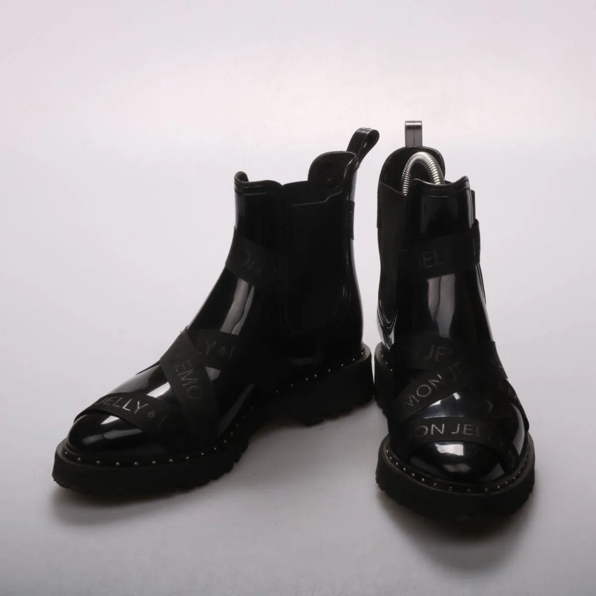 Женские ботинки Lemon Jelly в стиле челси из глянцевого материала, чёрного цвета, с эластичными вставками и ремешками с логотипом. Подойдут для города и дождливой погоды в межсезонье. Практичный плюс — легко очищаются, а тракторная подошва даёт лучшее сцепление.