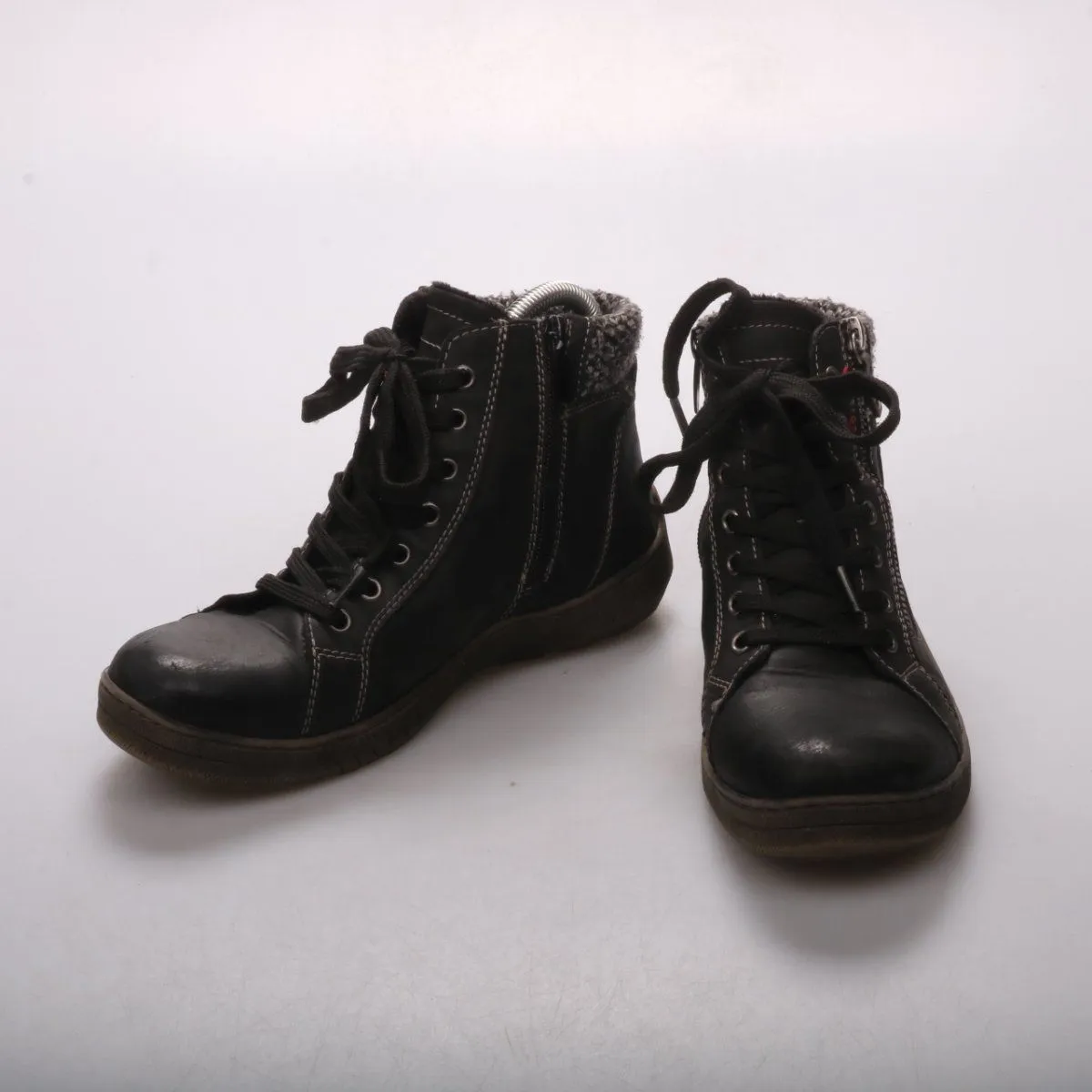 Женские чёрные ботинки на шнуровке с боковой молнией и мягким утеплённым кантом. Подойдут для повседневной носки в прохладную погоду и прогулок по городу. Практичное преимущество — удобная посадка за счёт шнуровки и быстрое надевание благодаря молнии.
