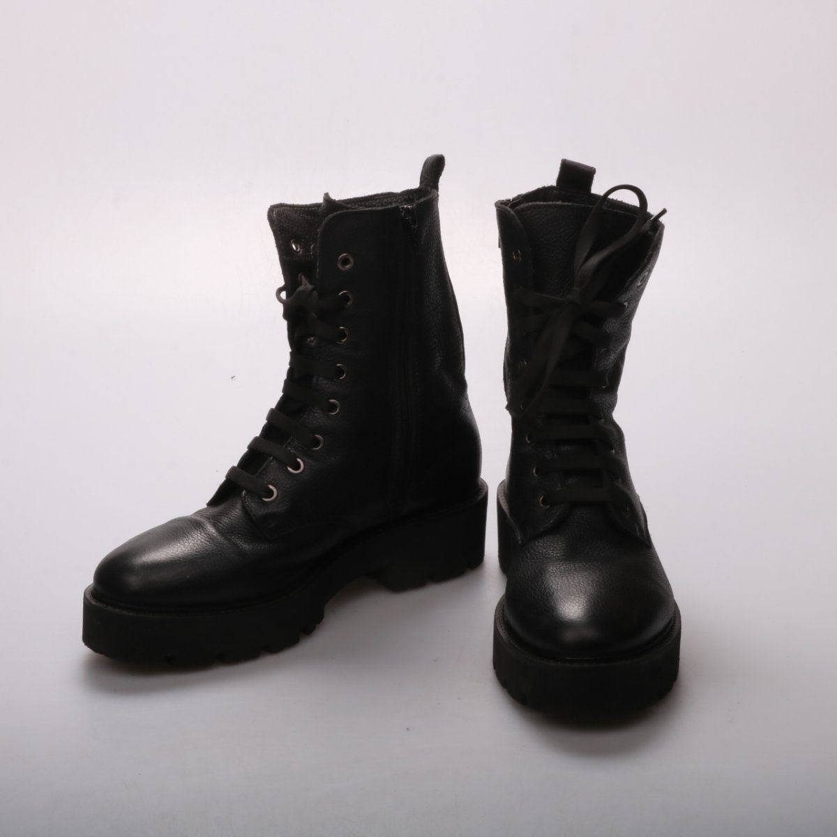 Чёрные ботинки на шнуровке с высокой посадкой и тракторной подошвой. Подойдут для повседневной носки в прохладную погоду и образов в стиле casual/grunge. Толстая рельефная подошва даёт хорошее сцепление и устойчивость на мокром асфальте.