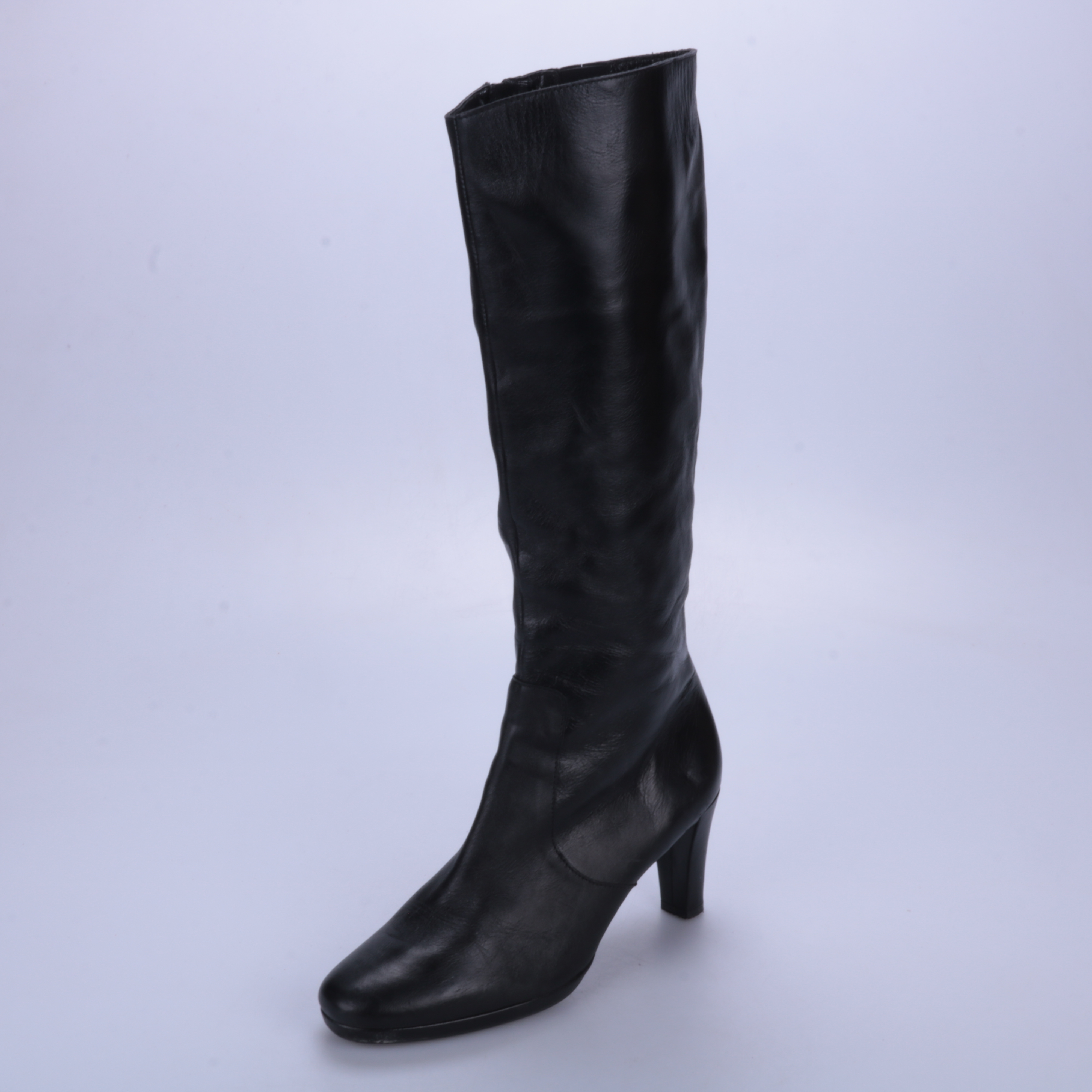 Женские сапоги из гладкой чёрной кожи на устойчивом каблуке, с молнией сбоку. Подойдут для повседневной носки и офисных образов в прохладную погоду. Практичны тем, что легко сочетаются с платьями и брюками и быстро надеваются благодаря молнии.