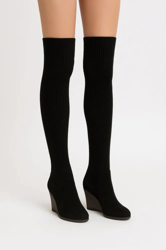 Женские сапоги-«носок» без бренда, чёрного цвета, с текстильным ребристым голенищем и устойчивой подошвой на танкетке. Подойдут для повседневных образов в прохладную погоду, хорошо смотрятся с платьями и юбками. Эластичное голенище плотно сидит по ноге...
