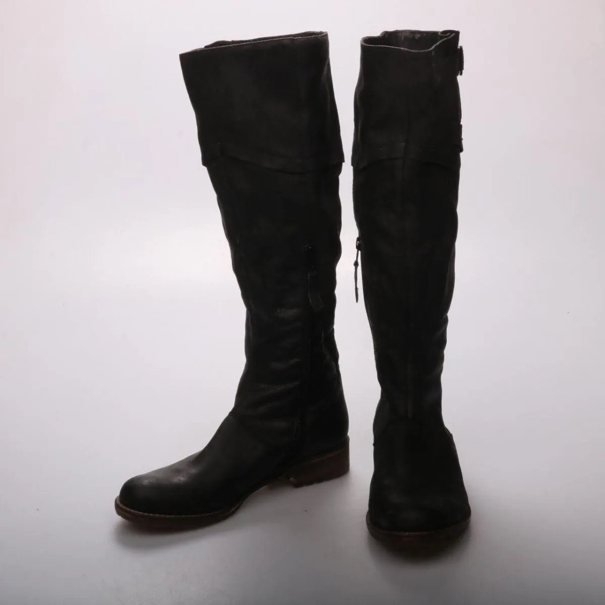 Женские сапоги без бренда, высокий голенище с декоративными ремешками и пряжками, сбоку молния. Подойдут для повседневной носки в прохладную погоду, хорошо сочетаются с джинсами и платьями. Устойчивая подошва с протектором даёт лучшее сцепление на мокром асфальте.