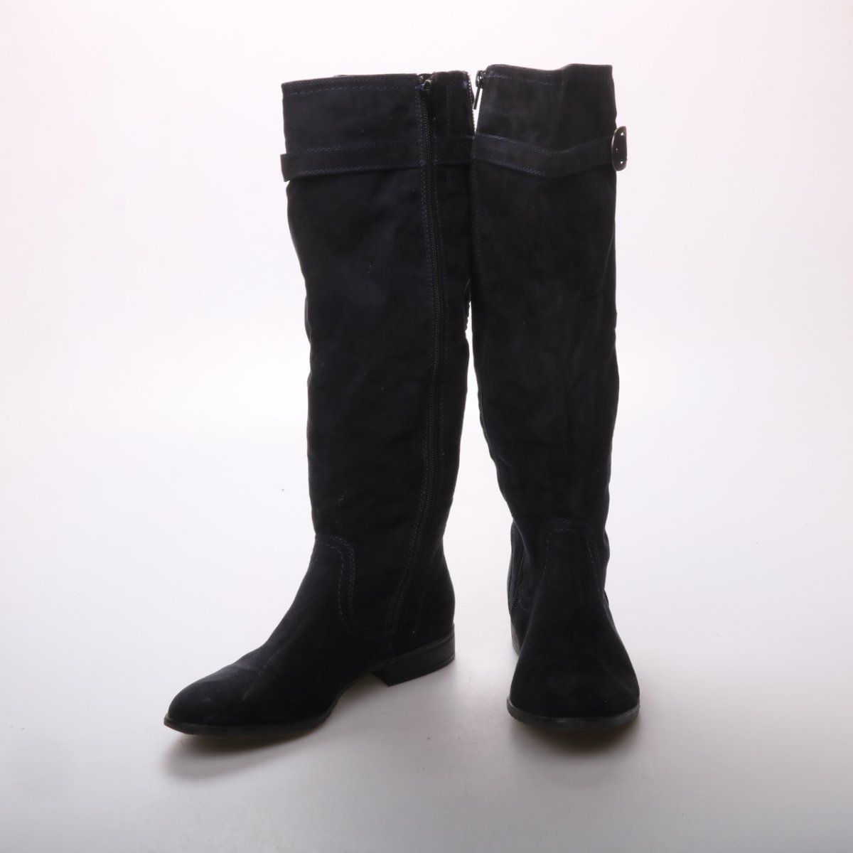 Женские сапоги из тёмной замши (нубука) с невысоким устойчивым каблуком и боковой молнией. Сверху есть декоративный ремешок с пряжкой, модель подойдёт для повседневной носки в межсезонье. Практичный плюс — молния по всей высоте облегчает обувание.