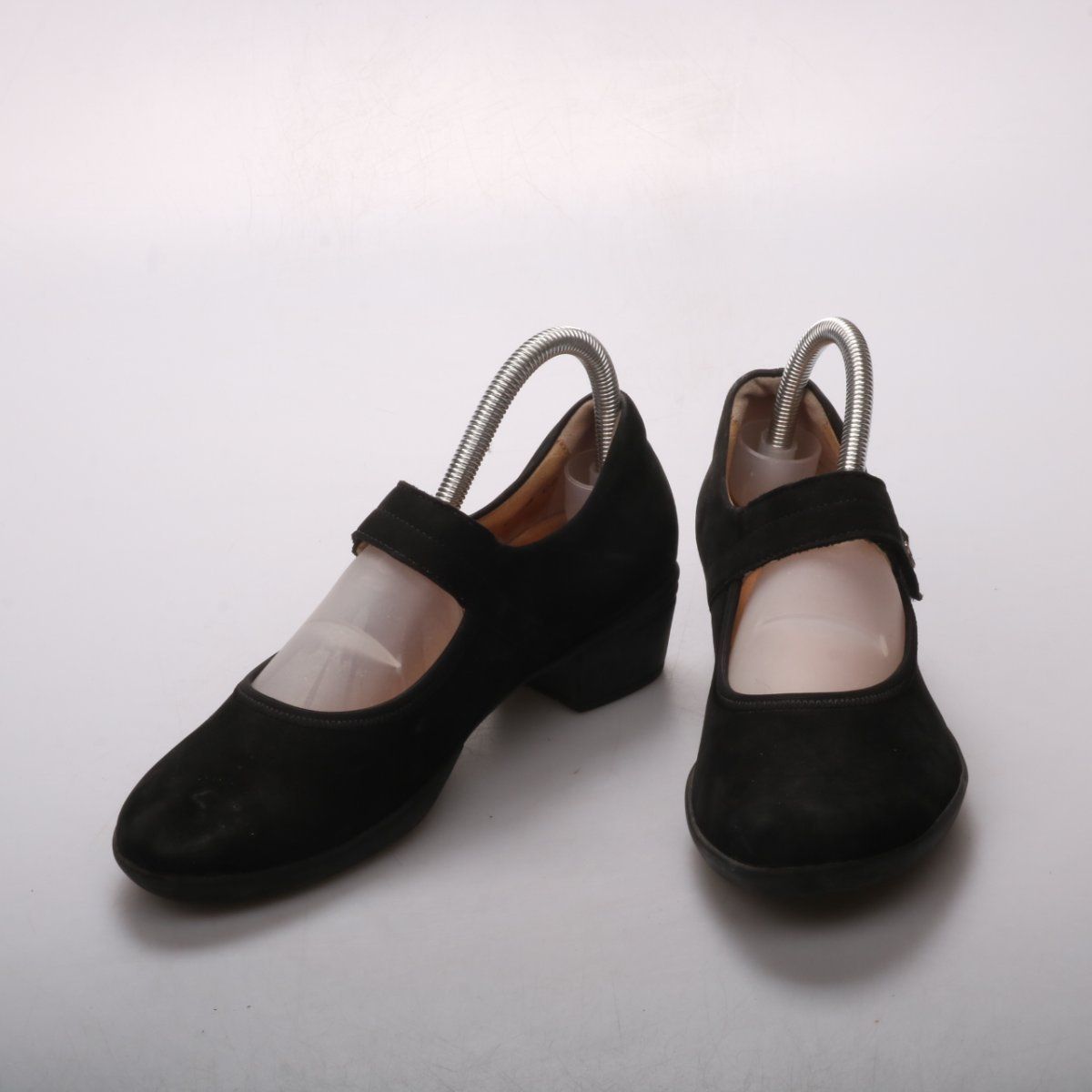 Женские туфли с ремешком (Mary Jane) на устойчивом невысоком каблуке, чёрного цвета. Подойдут для офиса и повседневной носки в прохладное время года. Ремешок фиксирует стопу, а широкая подошва делает ходьбу более устойчивой.