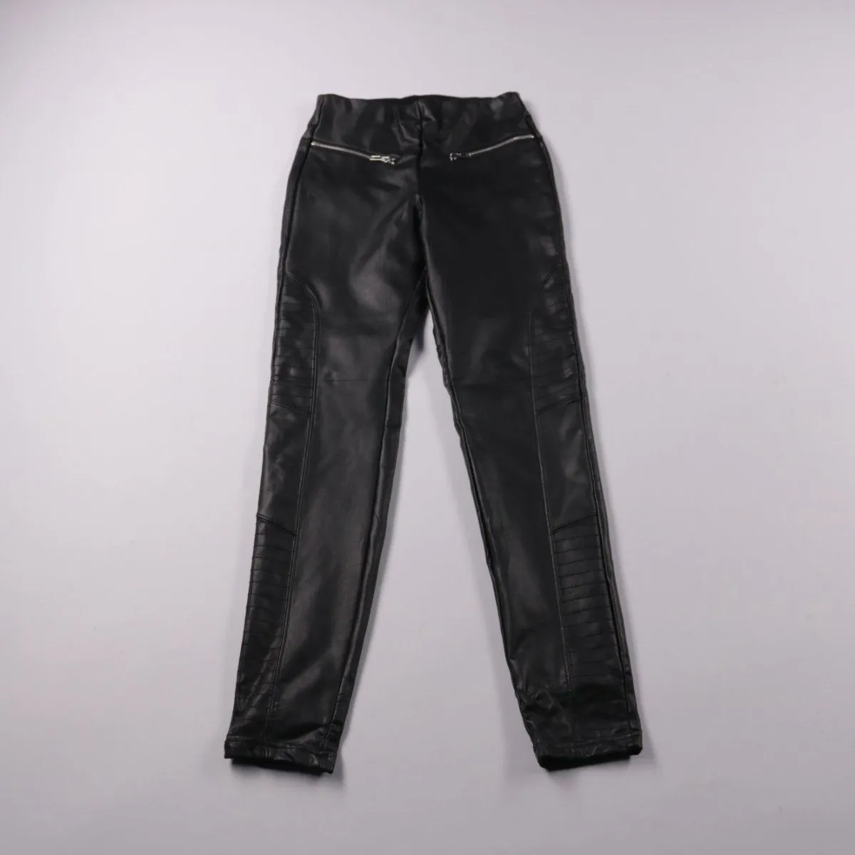 Женские брюки New Look из экокожи (полиуретан) с зауженным кроем и декоративными прострочками на коленях. Подойдут для повседневных городских образов в прохладную погоду, есть карманы на молнии. Материал легко протирается и не требует сложного ухода.