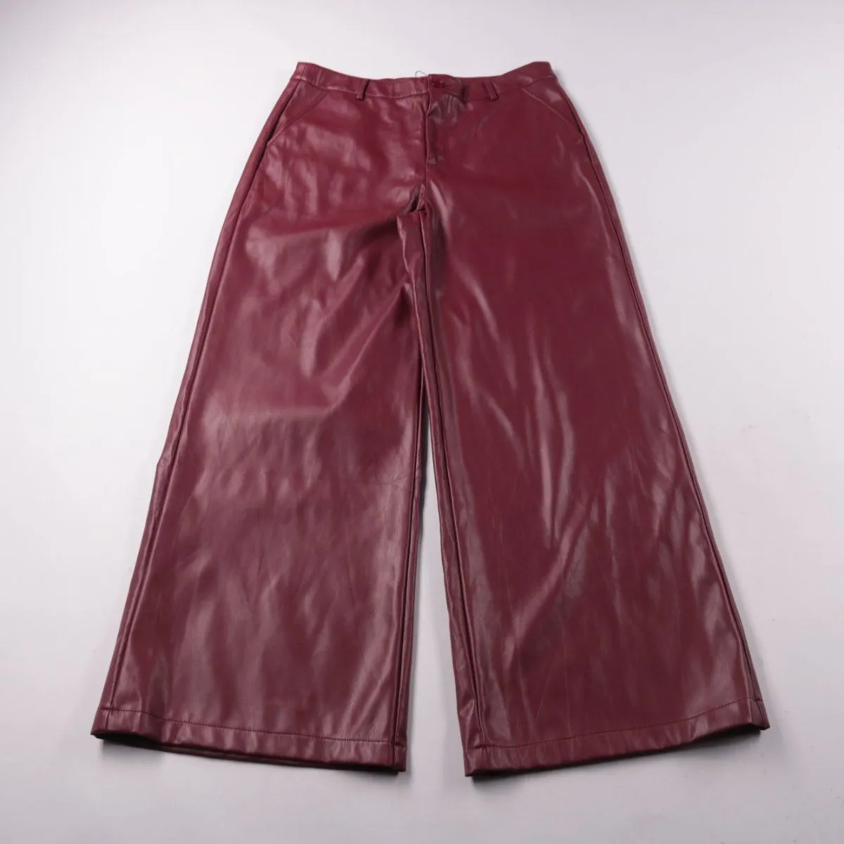 Бордовые брюки Boohoo из экокожи с широкими штанинами и поясом со шлёвками. Подойдут для городских образов в демисезон и прохладные вечера, хорошо сочетаются с обувью на каблуке и кедами. Практичны тем, что материал легко протирается и не требует сложного ухода.