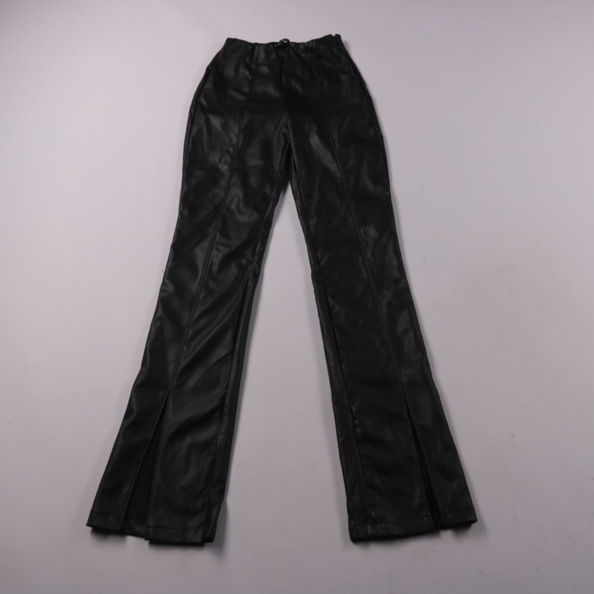 Брюки AMISU из экокожи, чёрного цвета, с лёгким клёшем к низу и эластичным поясом. Подойдут для повседневных образов в прохладную погоду и для вечерних выходов. Практичный плюс — материал легко протирается и не требует сложного ухода.