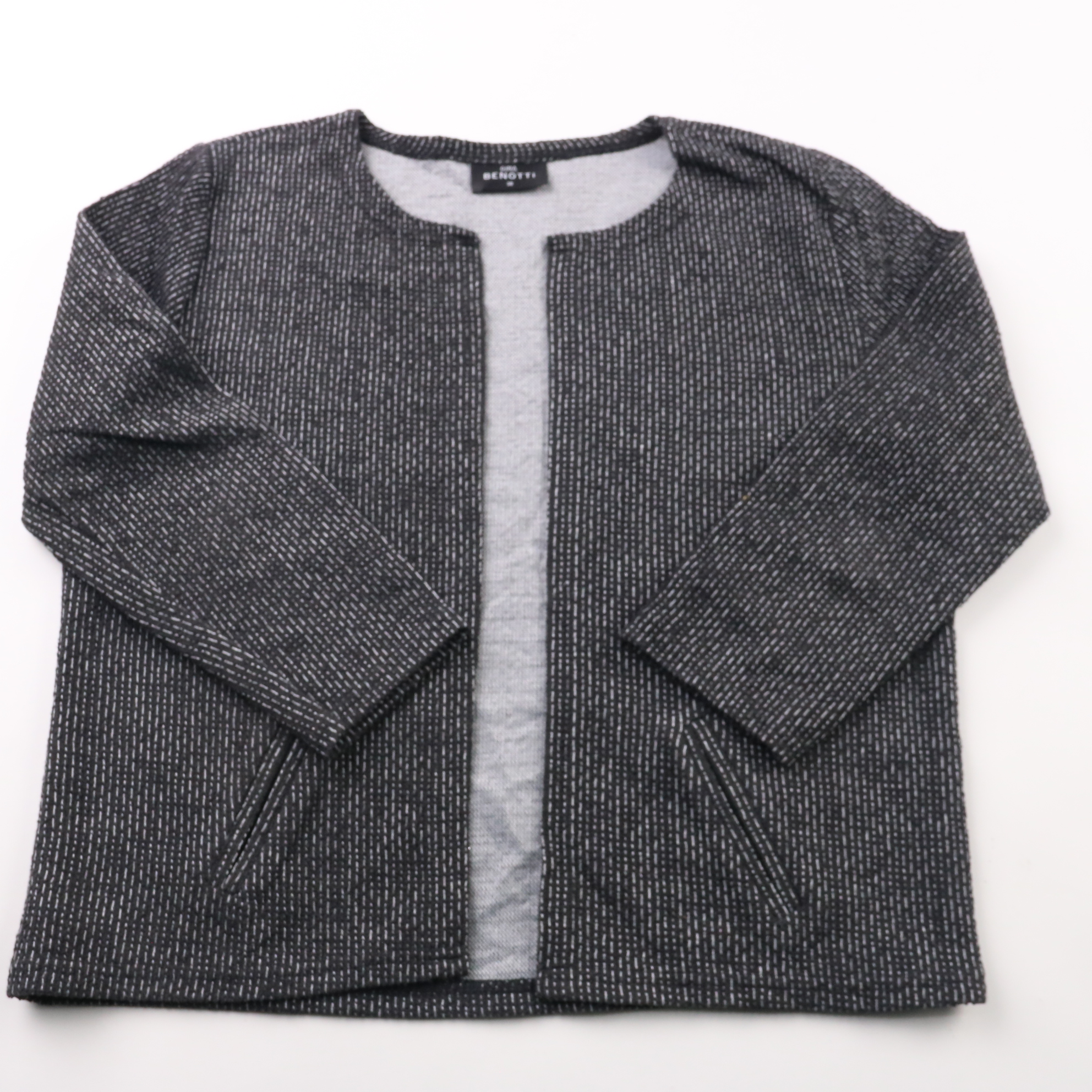 Женский жакет Gina Benotti из плотного трикотажа с фактурным узором в серо-чёрной гамме. Подойдёт для офиса и повседневных образов в прохладную погоду, удобно носить как лёгкий верхний слой. Практичный плюс — есть карманы и материал слегка тянется.